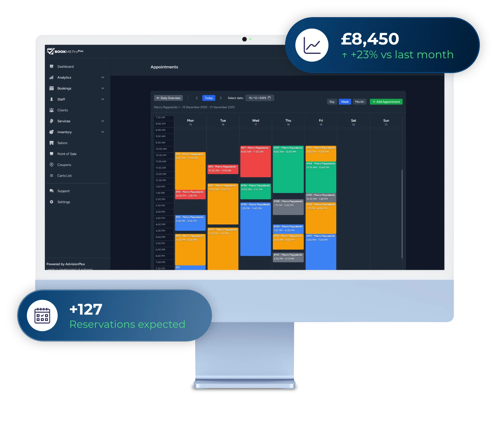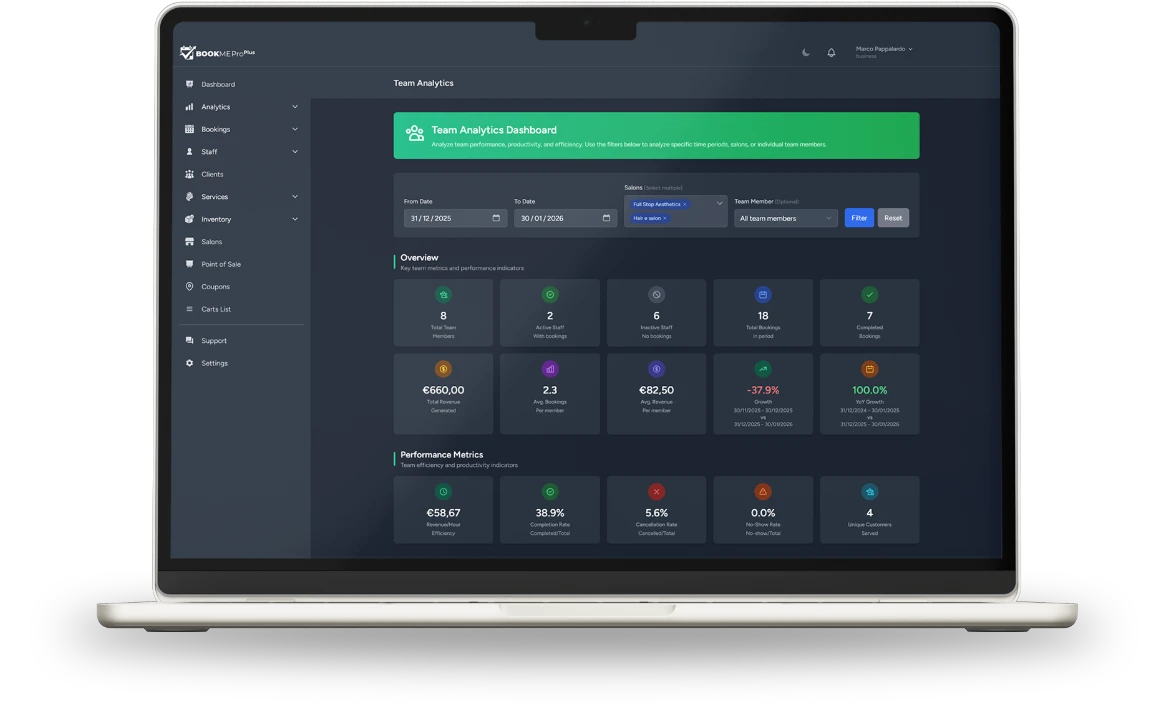 Analytics: Discover who performs best and which services drive the most revenue.