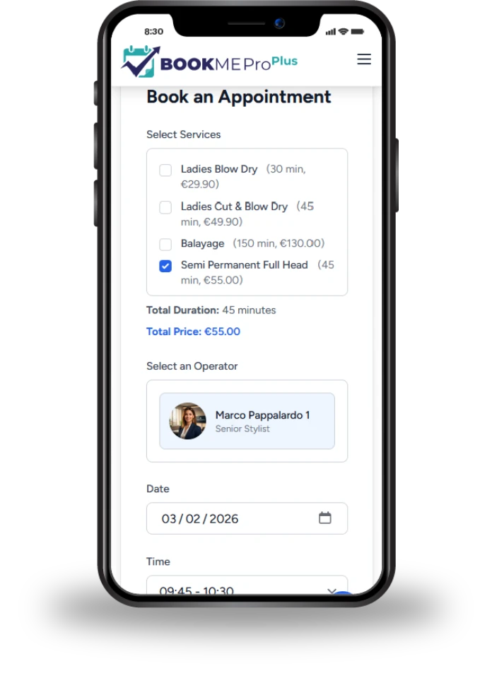 A single platform for scheduling, team, clients, POS, and inventory. Forget the chaos and missed appointments: grow your business with BookMeProPlus.